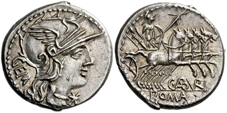 C. Aburius Geminus. 134 BC. AR Denarius 3.94 g. GEM, Helmeted head of Roma right, star beneath chin. / C ABVRI (partly ligate) beneath Mars in quadriga right, holding trophy, shield and whip. ROMA in exergue. Crawford 244/1; Sydenham 490; Aburia 1.