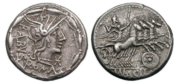 Man Acilis Balbus. 125 BC. AR Denarius. BALBVS ROMA, Helmeted head of Roma right; X before, all within laurel wreath / MN ACILI beneath Jupiter and Victory in fast quadriga right; Macedonian shield at lower right. Cr271/1; Syd 498.