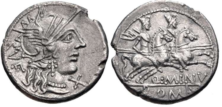 Q Minucius Rufus AR Denarius. 122 BC. Rome Mint. Helmeted head of Roma right, X beneath chin, RVF behind / The Dioscuri riding right, Q MINV beneath horses, ROMA in ex. Cr277/1, Syd 421.