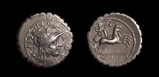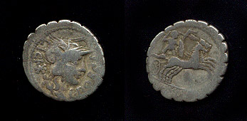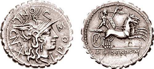 C Malleolus Cf Denarius Serratus. 118 BC. C•MALLE•C•F, helmeted head of Roma right, X behind / L•LIC•CN•DOM, warrior (Bituitus) driving Biga right, hurling spear and holding sheild and carnyx. Syd 524.