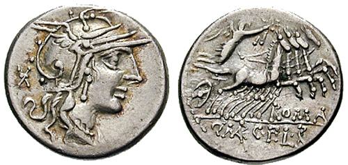 Q Marcius, C Fabius & L Roscius Denarius. 118-117 BC. Head of Roma right, * behind / Victory in quadriga right, holding wreath, ROMA below, Q•MAR•C•F•L•R in ex. Cr283/1a, Syd 541.
