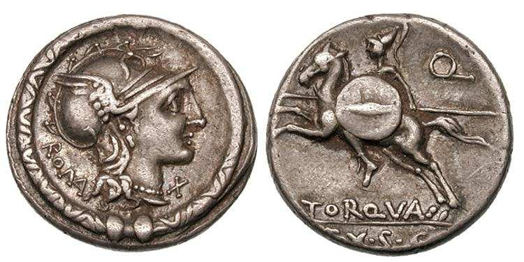 L. Torquatus. Denarius. 113-112 BC. AR Denarius 18.3mm., 3.88g. ROMA behind helmeted head of Roma right, X beneath chin, all within ornate torque. / Warrior galloping left. Q in upper right field, L TORQVA and SC below. Babelon Manlia 2; Crawford 295/1; Sydenham 545; Sear 172.