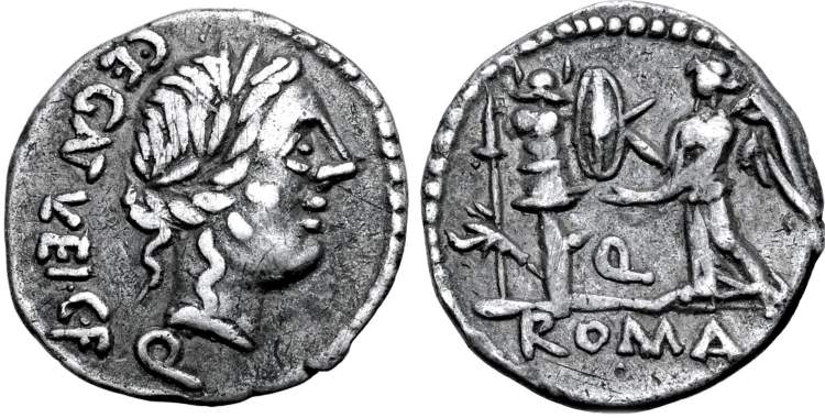 Quinarius of the Republic. 97 BC. Laureate head of Apollo / Victory inscribing shield on trophy. Egnatueleia 1, Syd 588.