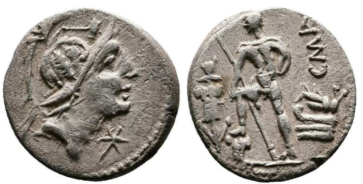 C Malleolus Denarius. 96 BC. Helmeted head of Mars right, mallet above, * below / warrior, holding spear and shield, standing left before trophy, foot on cuirass, CMAL above prow left (no symbol on prow). Cr335/3b, Syd 615.