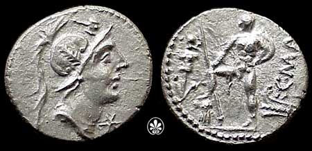C Malleolus Denarius. 96 BC. Helmeted head of Mars right, mallet above, * below / warrior, holding spear and shield, standing left before trophy, foot on cuirass; behing, C MAL above grasshopper, right, upon a prow, left. Cr335/3d; Syd 615a.