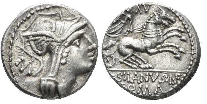 D Junius Silanus AR Denarius. 91 BC. Helmeted head of Roma right, control mark behind / Victory in biga right, holding reins in both hands, number above, D SILANVS L F below, ROMA in ex. Syd 646. Cr337/3.