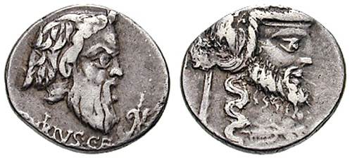 C Vibius Cf Pansa AR Denarius. 90 BC. Mask of Silenus right; thyrsos tied with fillets below / Mask of Pan right; syrinx before. Cr342/1,