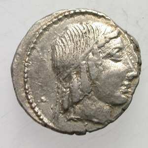 Caius Marcius Censorinus AR Denarius. 88 BC. Head of Apollo right / Free horse leaping right, symbol above, numeral below. Cr346/2b, Syd 714b.