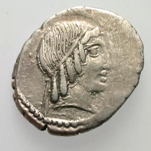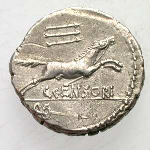 Caius Marcius Censorinus Denarius. 88 BC. Head of Apollo right / Free horse galloping right, C.CENSORI below, K above, I in ex. Cr346/2b, Syd 714d.