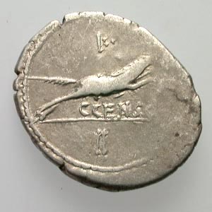 Caius Marcius Censorinus Denarius. 88 BC. Head of Apollo right / free horse galloping right, C.CENSORI below, three arrows above, caduceus in ex. Cr346/2b, Syd-714.