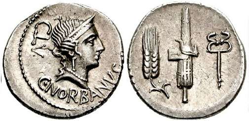 C Norbanus Denarius. 83 BC. Number behind, C NORBANVS below, diademed head of Venus right / Corn ear, fasces and caduceus. Syd 739, Cr357/1b.
