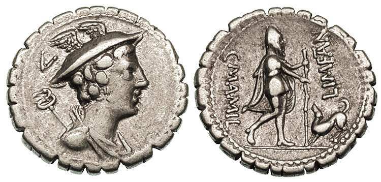 C. Mamilius Limetanus denarius serratus c. 82 BC. Draped bust of Mercury right, wearing winged petatos, letter and caduceus behind head. / C MAMIL LIMEAN Ulysses walking right, his dog at foot right. Syd 741, Cr362/1.