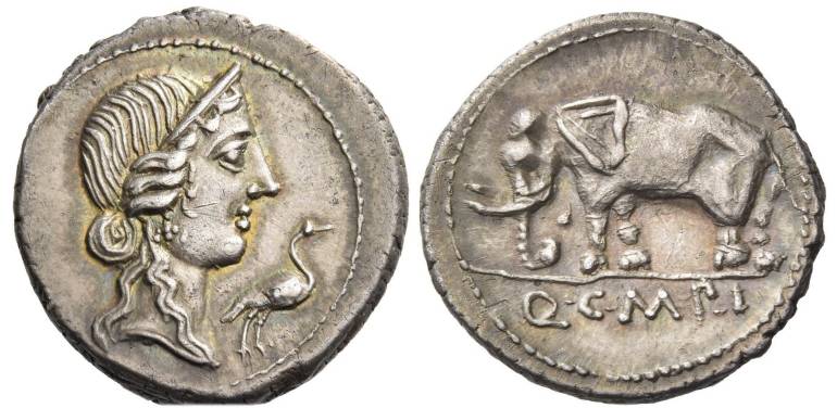 Q. Caecilius Metellus Pius. Spanish mint. Diademed head of Pietas right; stork standing right before head / Q C M P I beneath elephant walking left. Caecilia 43; Crawford 374/1; Syd 750; Sear 301.