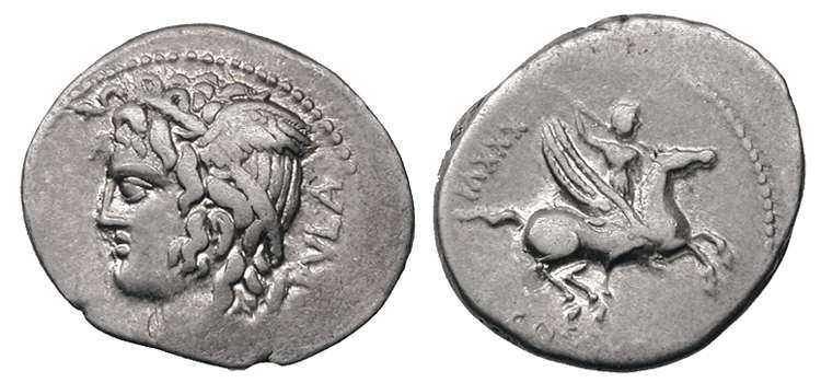 L Cossutius Cf Sabula AR Denarius. 72 BC. Head of Medusa left, winged & entwined with serpents / Bellerophon riding Pegasus right, hurling spear; XIII behind. Cr395/1; Syd 790.