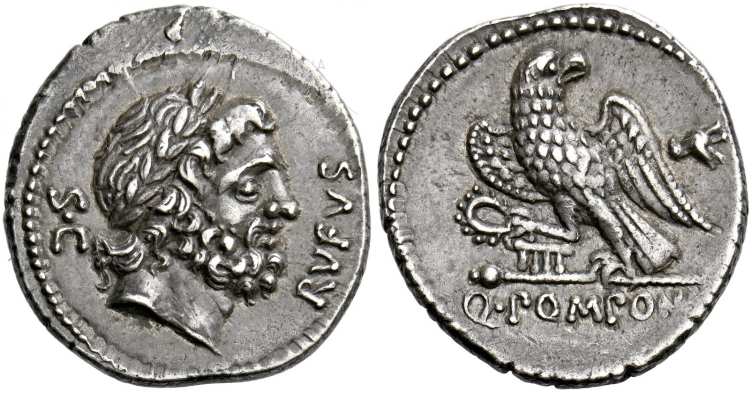 Q. Pomponius Rufus. Denarius 73, AR 3.96 g. RVFVS, Laureate head of Jupiter right, S·C behind head. / Eagle standing left on sceptre with left talon and holding wreath with right, III on sceptre's tip, bird in right field. Q·POMPO[NI] below. Babelon Pomponia 23. Sydenham 793; Crawford 398/1.