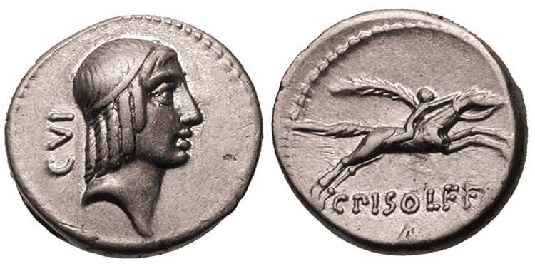 Calpurnia Piso L f Frugi Denarius. 67 BC. Head of Apollo right with fillet / Horseman galloping right, C PISO L F FRVGI, ROMA below; letter or symbol above and/or below. Syd 850, Cr408. (Note: poor and illegible examples removed but without renumbering the examples below)