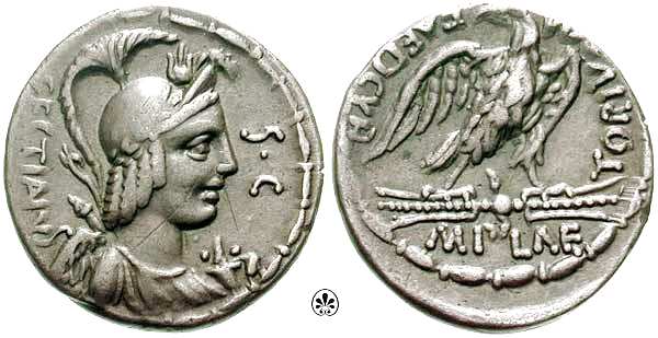 M. Plaetorius M.f. Cestianus. 67 BC. AR Denarius. Bust of an Vacuna right, wearing a wreathed and crested helmet, bow and quiver on shoulder, cornucopiae below chin / Eagle standing right on thunderbolt, head left. Cr409/1; Syd 809; Plaetoria 4.