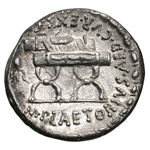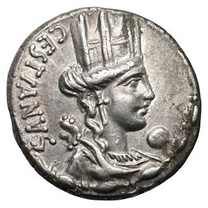 M. Plaetorius M.f. Cestianus. 67 BC. AR Denarius. Turreted bust of Cybele right; forepart of lion behind shoulder, globe under chin / Curule chair; grain to left. Cr409/2; Syd 808.
