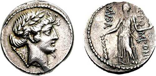 Q Pomponius Musa Denarius. 56 BC. Laureate head of Apollo right, sceptre behind / Q POMPONI MVSA, Melpomene, the Muse of Tragedy, standing right & leaning on column, holding club & mask. Cr410/4; Syd 816.