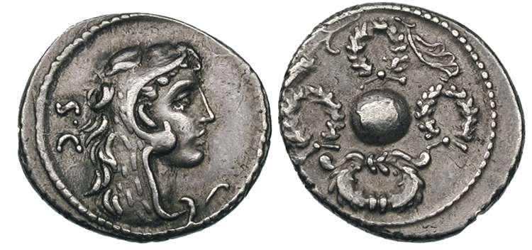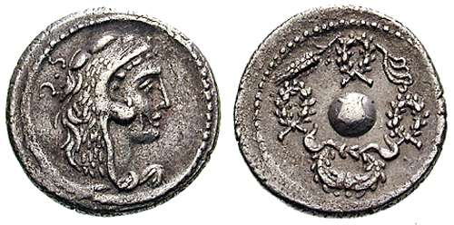 Faustus Cornelius Sulla AR denarius. c.56 BC. Head of Hercules right, in lion skin, SC TAP behind. / Globe between jeweled wreath and three triumphal wreaths.