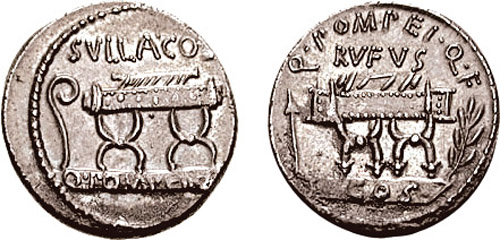 Q Pompeius Rufus AR Denarius. 54 BC. Rome mint. Q POMPEI Q F RVFVS above, curule chair flanked by arrow & laurel-branch; COS on raised tablet below / SVLLA COS above, curule chair flanked by lituus & a wreath; Q POMPEI RVF on raised tablet below. Cr434/2, Syd 909.