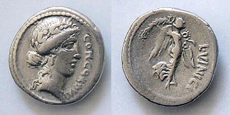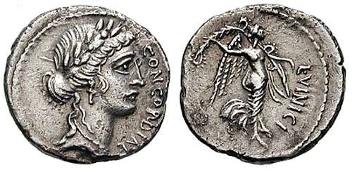 L Vinicia Denarius. 53 BC. CONCORDIA, laureate bust of Concordia right / L VINICI, Victory flying right, bearing palm branch to which are attached four wreaths.