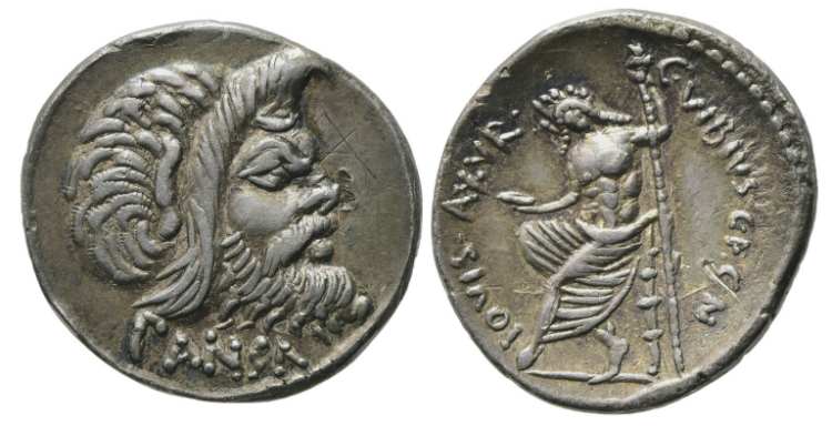 C Vibius Cf Cn Pansa Caetronianus Denarius. 48 BC. Mask of Pan right, PANSA below / IOVIS AXVR before, C VIBIVS C F C N behind, Jupiter Axurus seated left. Cr449/1a; Syd 947.