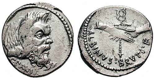 C Pansa & Albinus Bruti f AR Denarius. ca 48 BC. Mask of Pan right / Clasped hands holding winged caduceus. Cr451/1.