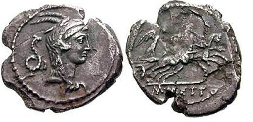 M. Mettius. Circa 44 BC. AR Quinarius. Juno Sospita in goat skin right; coiled serpant erect behind / Victory in biga right; M. METTI in exergue. Crawford 480/28; Syd 1048.