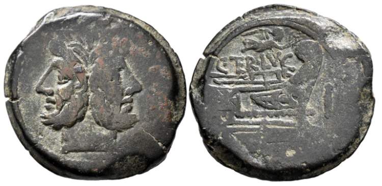 C. Terentius Lucanus, 147 BC. AE As, 33 mm, 22.83 g, Rome. Laureate head of Janus, I above. / Victory flying right above C•TER LVC, prow of galley right, ROMA below, I in right field. Babelon Terentia 11. Crawford 217/2. RBW 933. Sydenham 426; Sear 728; BMCRR 782.