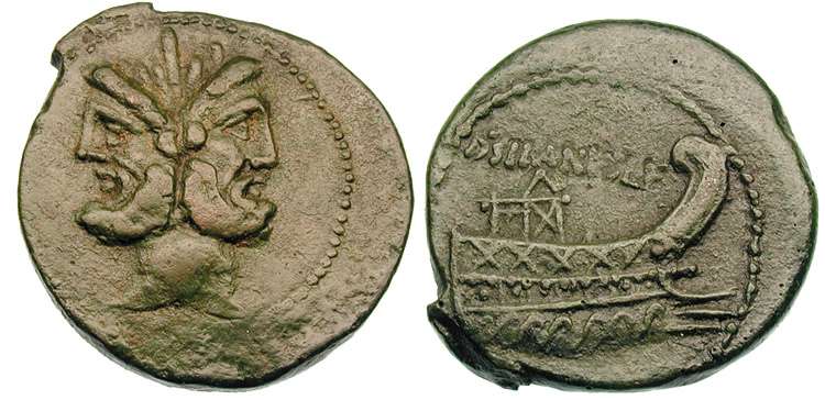 D Silanus Lf Æ As. 91 BC. Laureate head of Janus / prow right, D SILANVS LF above. Cr337/5; Syd 649.