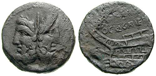 Vergilius, Gargilius & Ogulnius Æ As. 86 BC. Laureate head of Janus / Prow of galley left; OGVL GAR VER. Cr350A/3c; Syd 722b.