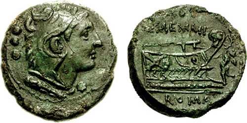 L Memmius Galeria Æ Quadrans. 106 BC. Head of Hercules right in lion's skin; ••• to left, club below / Prow of galley right, prow stem decorated with head of Venus; to right, cupid placing wreath on prow stem. Cr313/4, Syd 575b.