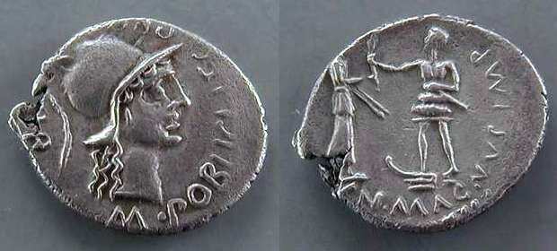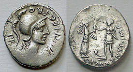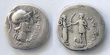 Pompey the Great 46-45 B.C. AR Denarius. Head of Roma r., in Corinthian helmet; before, M POBLICI LEG PRO, behind, P R / CN MAGNVS IMP, female figure standing right with shield & spears, handing palm to soldier on prow. Syd 1035. Cr469/1a.