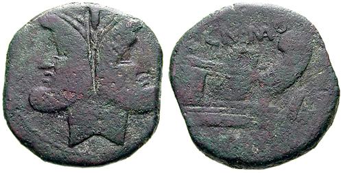 Cnaeus Pompey Junior AE As. Spanish or Sicilian mint, 46-45 BC. Laureate head of Janus, I above / prow of galley right, CN MAG (MA in monogram) above, IMP below, I before. RPC 486, Syd 471/1.