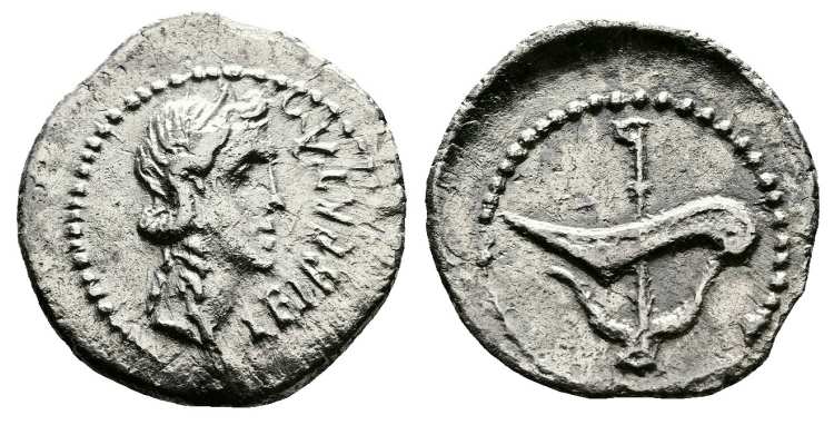 Roman Republic. M. Iunius Brutus, 43-42 BC. AR quinarius, 14.7 mm. 1.72 g. Military mint moving with Brutus. LEIBERTAS, laureate head of Libertas right. / Prow-stem and anchor in saltire. Crawford 506/3; Sydenham 1288; Junia 33; RBW 1779; RSC 5a; Sear 1442.