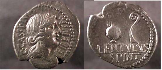 F Cassius AR denarius. C CASSI IMP LEIBERTAS, head of Libertas right / LENTVLVS SPINT, sacrificial implements. Cr500/3.