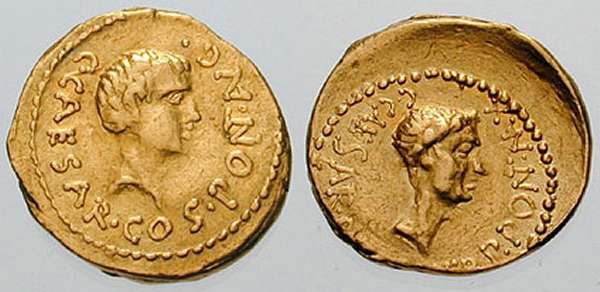 Octavian & Julius Caesar AV Aureus. Minted 43 BC in Gaul. C CAESAR COS PONT AVG, bare head of Octavian right / C CAESAR D[ICT P]ERP PONT MAX, laureate head of Caesar right. Cr490/2, Syd 1321.