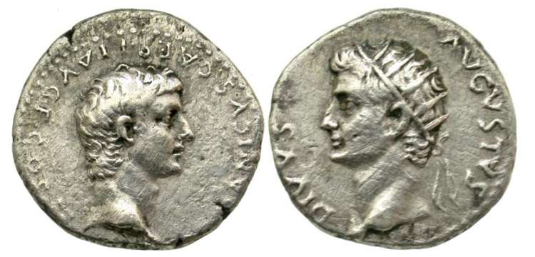 Germanicus & Divus Augustus AR Drachm of Caesarea, Cappadocia. Struck under Tiberius or Caligula, ca 33-38 AD. GERMANICVS CAES TI AVGV COS II G M, bare head right / DIVVS AVGVSTVS, radiate head of Augustus left. RSC 2, Syd 52, RPC I 3623b.
