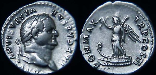 Vespasian Denarius. IMP CAESAR VESPASIANVS AVG, laureate head right / PON MAX TR P COS VI, Victory standing left on prow of ship, holding wreath & palm. RSC 368.