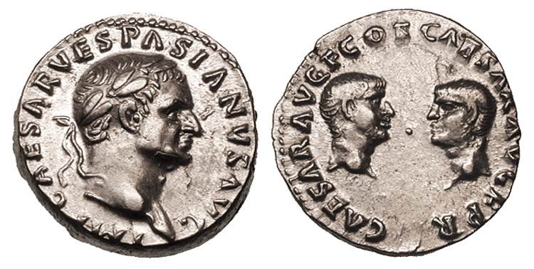 Vespasian, Titus & Domitian Denarius. 70 AD. IMP CAESAR VESPASIANVS AVG, laureate bust of Vespasian right / CAESAR AVG F COS CAESAR AVG F PR, heads of Titus & Domitian facing each other. RSC 5.