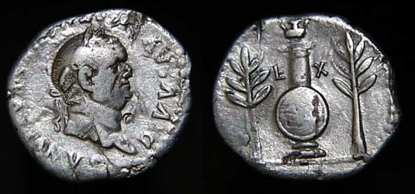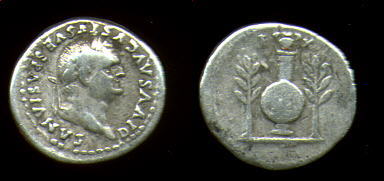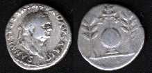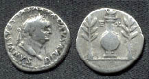 Divus Vespasian Denarius. DIVVS AVGVSTVS VESPASIANVS, laureate head right / E-X; SC on round shield set on column, upon which an urn sits, laurel branch to each side. RSC 149.