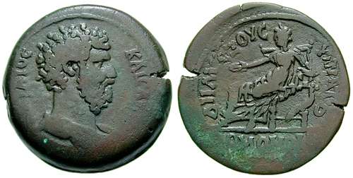 Aelius Caesar, 2nd Consulship, AE Drachm of Alexandria. L AILIOC KAICAP, draped bust right / DHMEXOYC YPAT B, OMONOIA below, Homonoia seated left, holding patera and cornucopiae. SNG Cop 419.