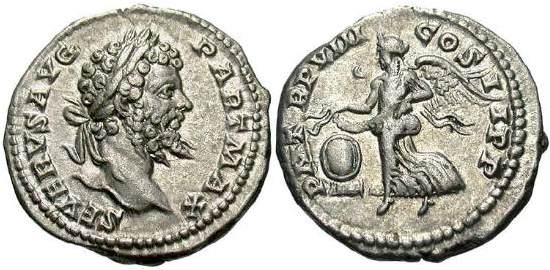Septimius Severus Denarius. SEVERVS AVG PART MAX, laureate head right / P M TR P VIII COS II P P, Victory flying left holding open wreath in both hands over round shield set on low base. RSC 454.
