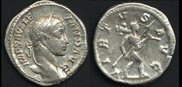 Severus Alexander Denarius. 228 AD. IMP SEV ALEXAND AVG, laureate head right / VIRTVS AVG, Romulus walking right, holding spear & trophy. RSC 584.