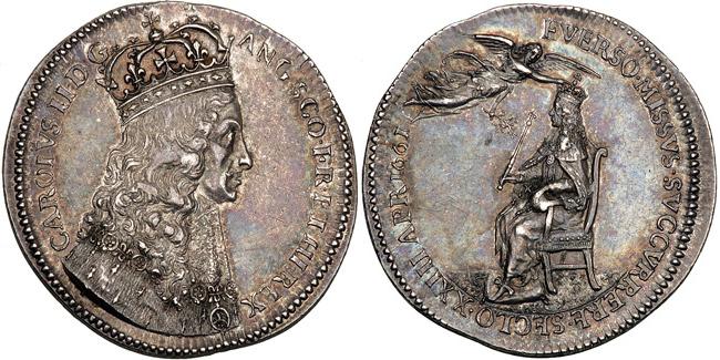 | Eimer 221 | Silver Coronation Medal, 1661. Charles II (1660-85). 29mm. King's portrait facing right, crowned and in the coronation vestments, signed "TS" on the truncation by Thomas Simon. / The newly crowned king seated in the Coronation Chair with the Angel of Peace above his head, blessing him. Dated April 1661. | Text | Image |