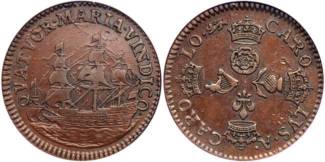 | Peck 398 | Pattern copper Ship Farthing (1662). 22.5 mm. Charles II. P-398. Dies by John Roettier. Straight-grained edge (not visible in the slab). Toothed borders. | Text | Image |