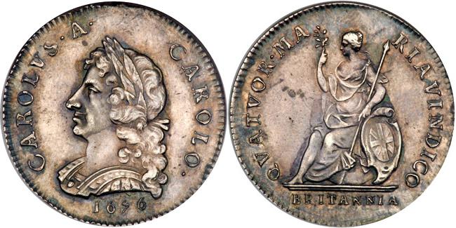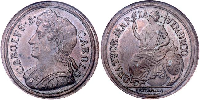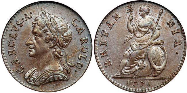 | Peck 436 | Pattern copper Farthing, 1671. Charles II. CAROLVS A CAROLO, laureate, cuirassed bust left. / BRITANNIA, Britannia sitting left, holding branch and sceptre, shield at her side. Peck 436. | Text | Image |