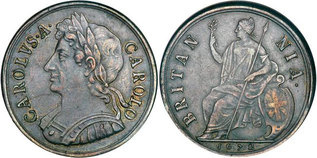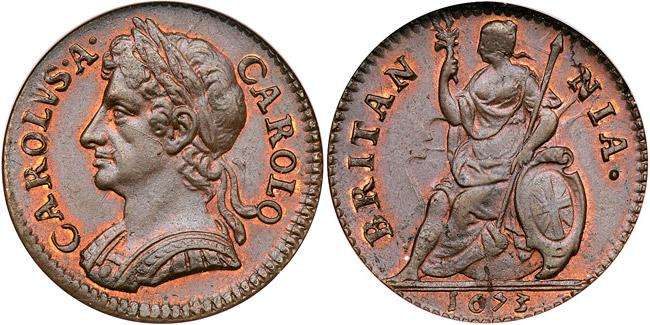 | Seaby 3394 | Charles II AE Farthing. CAROLVS A CAROLO, laureate cuirassed bust left / BRITANNIA, Britannia seated left holding branch and spear, arm resting on shield, 1672 in ex. Peck-520. | Text | Image |