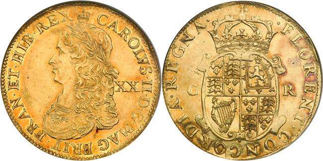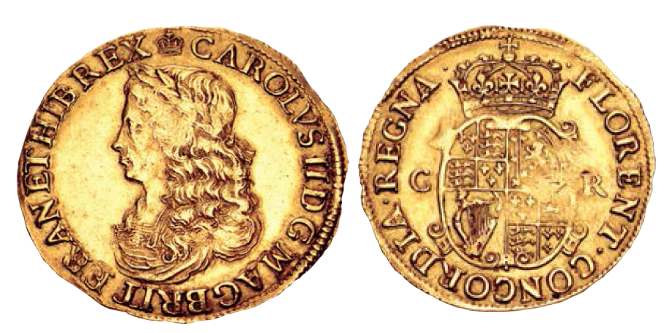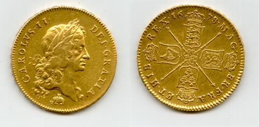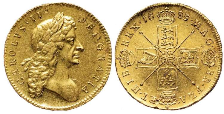 | Seaby 3331 | Charles II, AV 5 Guinea, 1660-1685). Dated 1683. CAROLVS II DEI GRATIA, laureate head right. / MAG BR FRA ET HIB REX, 1683, four crowned shields, four sceptres in angles with four interlinked C's in centre. Seaby 3331. | Text | Image |